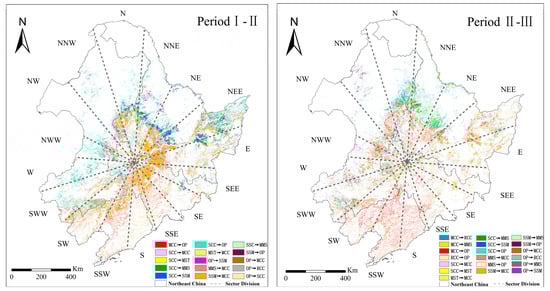 The conversion trajectories of cropping patterns revealed significant differences in their spatial evolution at different stages (Figure 9). During Period I to Period II, SSM to MCC showed the highest proportion of transfers, mainly concentrated in the central part of the study area, forming a crescent shape from NNW to SSW in a clockwise direction. However, from Period II to Period III, this transfer significantly declined and was only sporadically distributed from the Sanjiang Plain to the Songnen Plain. Moreover, SCC to MCC encircled the core of the study area’s sectors during the first stage (Period I to Period II). It showed a declining trend towards the center in the second stage (Period II to Period III). Furthermore, in the first stage, the transfer from SCC to SSM was distributed in a belt from NNW to ENE in a clockwise direction. In the second stage, it concentrated in the NNW, N, and NNE directions, showing a trend towards evolving into SSM in the northern area. During the study period, a significant proportion of SCC also converted to MMS (NNE) and MST (NNW, N, and NNE) in the northern direction. Similarly, the change from MMS to MCC was mainly concentrated in the southeastern part of the study area’s central area (east to south direction). It showed an expanding trend towards the northwest direction of the Songnen Plain (NNW, NW, and WNW).