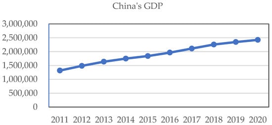 Rural development has become a critical component of integrated national development in response to global challenges such as urbanization, growing wealth disparity, and environmental sustainability. Targeted measures are necessary to unlock the potential of rural areas [], improve the quality of life for farmers, and contribute to the national economy, as these areas often face inadequate infrastructure and slow economic development. The revitalization of rural areas varies across countries. For instance, France has implemented the “Most Beautiful Villages” initiative to boost rural incomes and promote tourism []. In Germany, a cooperative model is employed to foster sustainable rural development by encouraging community cohesion, resident participation in development planning, and comprehensive village development []. In China, the focus initially addressed the significant number of impoverished rural residents. In 2015, the Chinese government initiated a poverty eradication initiative that ultimately resulted in the complete eradication of absolute poverty nationwide by 2020. This initiative lifted all 832 national-level poverty-stricken counties out of poverty, ensuring that the people no longer had to worry about food and clothing and that they were guaranteed compulsory education, basic healthcare, and housing security. After that, the emphasis of China’s rural efforts shifted from poverty management to rural revitalization. The rural revitalization strategy, introduced in 2017, aims to modernize rural areas and address the urban–rural development gap. Subsequent policies have targeted improvements in rural ecology, talent, culture, and industry. By 2020, rural road mileage had reached 4.38 million km (data is from the 2020 Transport Industry Development Statistical Bulletin), and agricultural mechanization levels rose to 71.25% (the data is from China Statistical Yearbook 2020). Figure 1 illustrates the change in Chinese GDP from 2011 to 2020. As illustrated in Figure 1, China’s GDP increased by 84.12%, from 1,316,745.829 in 2011 to 2,424,394.831 in 2022. Moreover, the rural revitalization strategy has achieved comprehensive improvements in rural areas, including advancements in the economy, education, and healthcare, laying a strong foundation for future development.