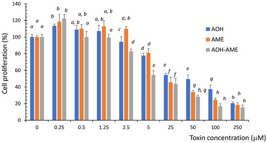 The effect of exposure to 0 to 250 μM of AOH, AME, and a combination of the two on the viability of IPEC-1 cells; the results represent the mean ± standard error of the mean (SEM) of three independent experiments, n = 6. Differences among groups were tested using one-way ANOVA followed by Fisher’s PSLD test. a–h indicate significant differences between treatments (p < 0.05).