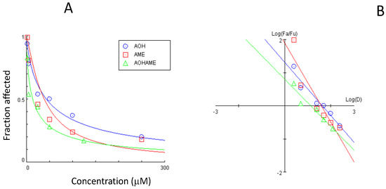 The dose–effect curve and the median-effect plot for the AOH and AME combination are presented in Figure 2.