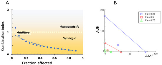 Interrelation between combination index and fraction affected (A) and isobologram for the combined AOH-AME (B).