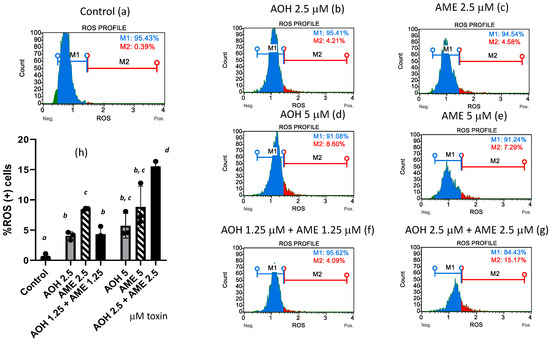 Effect of AOH, AME, and a combination thereof on the % of ROS (+) cells. Quantification of ROS (+) cells% was performed by flow-cytometry analysis in IPEC-1 cells that underwent 24 h of exposure to AOH, AME, and a combination of the two (ratio 1:1) in concentrations from 0 to 5 μM. M1 = %ROS (−) cells; M2 = %ROS (+) cells. Figures (a–g) represent flow-cytometry histograms for different treatments; figure (h) represents the effect of AOH, AME, and a combination of the two on the % of ROS (+) cells; the results represent the mean ± standard error of the mean (SEM) of three independent experiments, n = 6. Differences among groups were tested using one-way ANOVA followed by Fisher’s PSLD test. a,b,c,d indicate significant differences between different treatments (p < 0.05).