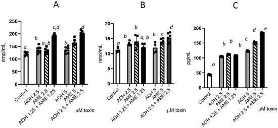 Effects of AOH, AME, and a combination of the two in concentrations from 0 to 5 μM on different parameters associated with oxidative stress—lipid oxidation (TBARSs), protein oxidation (protein carbonyl), and DNA oxidation (8 oxo dG); the results represent the mean ± standard error of the mean (SEM) of three independent experiments, n = 6. (A) Effect of AOH, AME, and a combination of the two on protein carbonyl concentrations; (B) effect of AOH, AME, and a combination of the two on TBARSs; (C) effect of AOH, AME, and a combination of the two on 8-Oxo-2′-deoxyguanosine. Differences among groups were tested using one-way ANOVA followed by Fisher’s PSLD test. a–e indicate significant differences between treatments (p < 0.05).