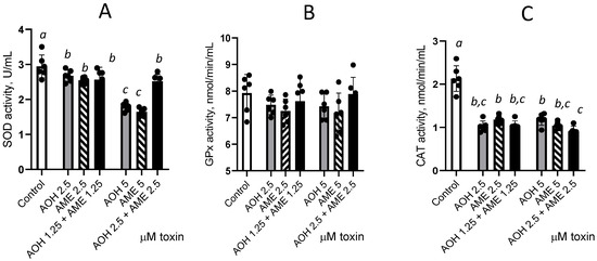 Effect of AOH, AME, and their combination in concentrations from 0 to 5 μM on the activity of the enzymes involved in the oxidative stress. The activities of superoxide dismutase (SOD), figure (A), glutathione peroxidase (GPx), Figure (B), and catalase (CAT), Figure (C), were analyzed from IPEC-1 cell lysates; the results represent the mean ± standard error of the mean (SEM) of three independent experiments, n = 6. Differences among groups were tested using one-way ANOVA followed by Fisher’s PSLD test. a,b,c indicate significant differences between different treatments (p < 0.05).