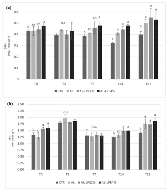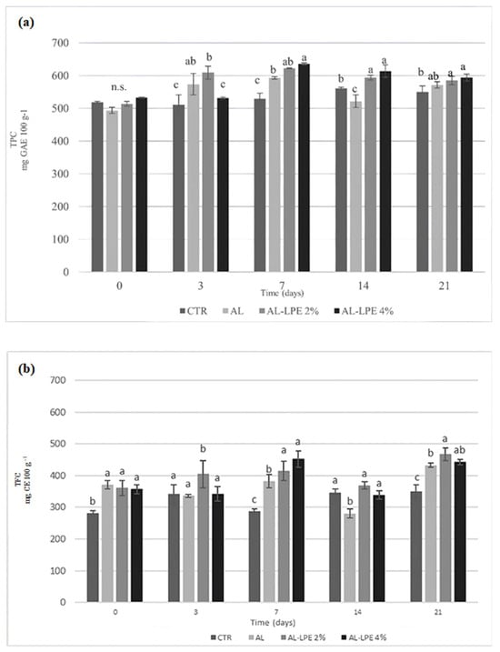 | AL-LPE 4% | 191.65 ± 10.11 | 201.86 ± 0.09 | 183.02 ± 13.55 | 167.81 ± 0.76 b | 178.98 ± 2.12 | n.s. | |
