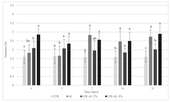 | AL-LPE 4% | 21.00 ± 0.00 A | 17.70 ± 0.75 Ba | 14.92 ± 1.06 C | 12.50 ± 2.12 Da | 8.80 ± 0.64 Eb | ** | |