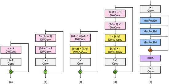 In this study, we integrate the LSKA module into the SPPF module, positioning it after all max-pooling operations and before the second convolutional layer, as shown in Figure 3e. This placement is strategic to leverage large kernel convolutions and spatial expansion convolutions at critical points of feature extraction and fusion, thereby maximizing feature representation capability while controlling the computational load and complexity of the model.