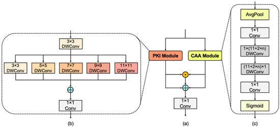 A PKI Block consists of a PKI module and a CAA module, as shown in Figure 4a. The PKI module utilizes a non-dilated Inception-style depth convolution structure, depicted in Figure 4b. It first employs a small kernel convolution to capture local information, followed by a series of parallel depth convolutions to extract multi-scale texture features at different receptive fields. Finally, a 1 × 1 convolution integrates features with varying receptive field sizes.
