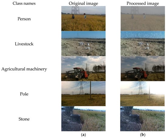For field operations, it is crucial that the training data used for obstacle detection accurately reflect the real-world perspectives encountered by agricultural machinery in the field, ensuring appropriate realism and feasibility. Our dataset comprises images from two sources. The first set of images was captured using an Intel Realsense D435i RGB-D camera (Intel Corporation, Santa Clara, CA, USA), with video sliced into frames using Python scripts, allowing for the acquisition of images from various perspectives and scenes. These images were collected in October 2023 from rice and wheat fields in Huishan District, Wuxi, Jiangsu Province, China, at multiple times during the day, including early morning, noon, and dusk, ensuring a diversity of lighting conditions. The second part of the dataset was assembled using images of various types of obstacles sourced from search engines such as Google and Baidu. These images come from a wide range of backgrounds, resolutions, and shooting angles, thereby increasing the dataset’s diversity. Combining these two sources, we assembled a raw dataset of 2378 images, each with a resolution of 640 × 480 pixels. Every image contains at least one target object, ensuring that the model can reliably learn and validate across different datasets. The dataset primarily includes five types of typical field obstacles: person, livestock, agricultural machinery, pole, and stone. Sample images from the dataset are shown in Figure 6a. The raw dataset was randomly split into training, validation, and test sets in an 8:1:1 ratio.