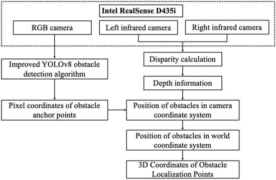 In the process of distance measurement, the accuracy may vary due to differences in the specifications of binocular cameras. The binocular camera used in this experiment is the Intel RealSense D435i, which measures depth by calculating the distance based on the disparity generated on the imaging planes of the left and right infrared cameras [28]. The principle of disparity is illustrated in Figure 8, where the imaging points of the obstacle’s center in the left and right cameras are and . Since the left and right cameras are on the same horizontal plane, the -coordinates in the horizontal direction are identical, ; denotes the focal length of the cameras, and represents the baseline, which is the distance between the origins of the two cameras. According to the principles of triangulation, we derive the equation below.