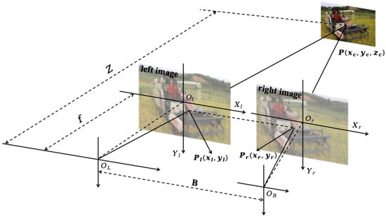 Currently, the detection of field obstacles primarily relies on radar and visual sensors. Radar typically employs 2D/3D LiDAR for data acquisition, determining obstacle positions through LiDAR point cloud processing [2,3]. Considering the cost and the complexity of the farmland environment, visual sensors are more suitable for field obstacle detection than radar. Visual sensors offer the advantage of providing rich information about obstacles, including classification, shape, and texture [4]. Common visual sensors include monocular and binocular cameras. Monocular cameras estimate target depth using image data from a single viewpoint. In contrast, binocular cameras leverage parallax and matching features from different viewpoints to obtain three-dimensional spatial information, enabling the precise localization of targets [5,6].