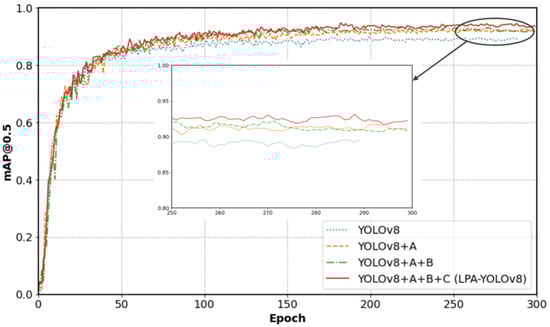 To evaluate the effectiveness and feasibility of the improved YOLOv8 algorithm, we conducted ablation experiments. This study introduced three improvements to the baseline YOLOv8 model: Improvement A: integrating the LSKA into the SPPF module; Improvement B: replacing the Bottleneck with the PKI Block; and Improvement C: adding an Aux head to the head section. By incorporating each improvement module individually into the baseline model, we could compare the impact of adding or replacing modules in the original model. The experimental results are shown in Table 3. Due to the early stopping mechanism, the baseline model stopped at 290 epochs, while the other models completed 300 epochs of training.