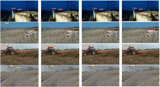 The obstacles were categorized into five types: agricultural machinery, person, livestock, stone, and pole. Using the labeling tool, obstacles in the images were annotated by type, and the resulting txt files were used to store the data label information for each category. Table 1 shows the dataset quantities and label counts for the five categories. Before training the model, we performed image processing on the training set to enhance the model’s generalization and robustness. We added weather and environmental effects such as fog, rain, glare, and darkening. Some processed images are shown in Figure 6b. Simulating image processing under various weather conditions enables the model to maintain high detection performance in adverse environments. For example, under low visibility conditions such as dense fog or heavy rain, the model remains capable of effectively identifying field obstacles, thereby ensuring the safe operation of agricultural machinery. Furthermore, the model’s adaptability to different lighting conditions, including shadows and reflections, enhances its robustness across various times of day and weather conditions. The classification quantities of the preprocessed dataset are detailed in Table 2.