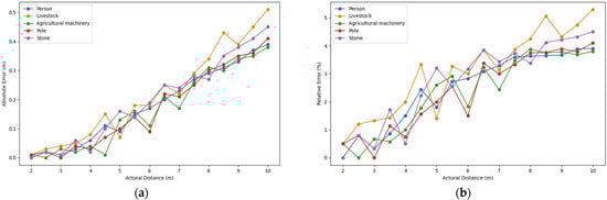 The experimental results were plotted to create comparative statistical graphs, as shown in Figure 11. The results indicate that within the range of 2 to 10 m, the maximum average absolute error and maximum average relative error in measured distances were 0.22 m and 3.06%, respectively. The maximum absolute error and maximum relative error in measured distances were 0.53 m and 5.30%, respectively. Higher relative errors were observed in the positioning of livestock and stones, primarily due to occlusion by crops and the greater mobility of livestock. Additionally, Table 5 shows that measurement results are relatively accurate at close to medium distances from obstacles, with errors increasing gradually as the distance between obstacles and the camera increases.