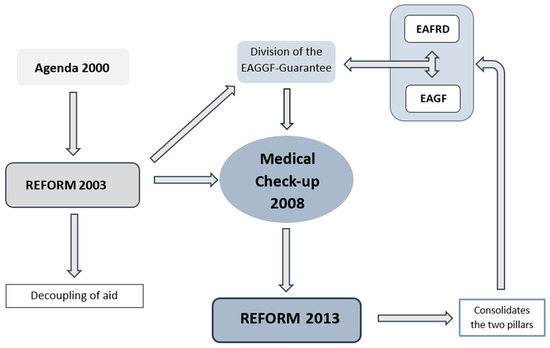 In recent years, the Common Agricultural Policy (CAP) of the European Union (EU) has undergone significant transformations, marking a substantial evolution (Figure 1) in the way challenges and opportunities in the European agricultural sector are approached [1,2]. The CAP, created with the aim of ensuring food security, promoting rural development, and sustaining the economic viability of farmers in EU member countries [3,4], has responded to changing dynamics both internally and externally. The CAP has also been seeking to improve economic and social disparities between the EU’s agricultural regions, promoting territorial and social cohesion in these regions [5,6,7]. The introduction of rural development policies and programmes has been instrumental in this direction, promoting economic diversification and improving the quality of life in rural areas [8,9,10].