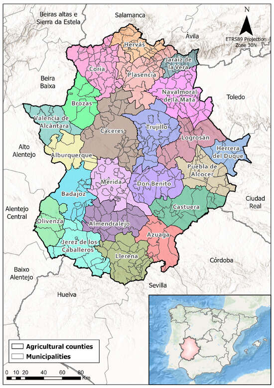 The agricultural counties were used as a territorial reference framework since this allows municipalities to be situated within a delimitation from an agrarian point of view, representing areas that show a certain homogeneity both in their productive capacity and in their systems of exploitation and agricultural use as well as a similar economic development [56,57]. Therefore, Extremadura was organised into 22 agricultural counties (Table 1), 12 of which are located in the province of Badajoz and 10 in the province of Cáceres.