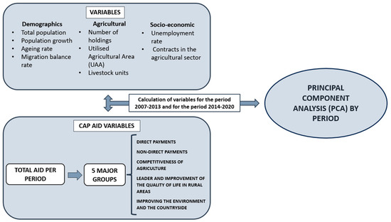 Subsequently, a process was carried out to compile variables related to CAP aid with which to study it quantitatively. These variables were obtained from two different sources depending on availability, so for the years 2007–2016, they were collected from the Ministry of Agriculture, Rural Development, Population, and Territory of the Regional Government of Extremadura and for 2017–2020 from the portal for open data information of the Spanish Agricultural Guarantee Fund (FEGA). Thus, the annual data correspond to the CAP aid received according to the different financial years from October to October of each year. Due to the fact that the data come from two different sources, the values of the amounts of CAP aid between 2007 and 2016 in the EAGF and EAGF aid series by FEGA [48,49] paying agencies were checked at the annual level, with the aim of observing that the values corresponded to those used for this study. Next, a process of grouping the aid into five major groups, i.e., into five new variables, was carried out to simplify the information by adding up the total amounts of these variables for subsequent application in absolute values in the PCA model. Therefore, grouping CAP aid into five groups is justified for several reasons: In the first place, the experience of previous work has demonstrated the effectiveness of this methodology for understanding the application of aid at the municipal level [2]; secondly, it allows for a homogeneous categorisation of aid, thus facilitating comparative analysis; and finally, it avoids the excessive dispersion of data that would make it difficult to obtain a comprehensive view of the impact of this aid on Extremadura’s society. These new variables include the following: direct payments, non-direct payments, competitiveness of agriculture, LEADER and improvement of the quality of life in rural areas, and improvement of the environment and the rural countryside. These, together with the agricultural, socio-economic, and demographic variables, were correlated in the PCA, establishing the two periods of 2007–2013 and 2014–2020, as these are the last two periods of completed European budgetary programming.