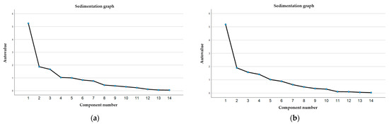 In relation to the above, the decision to extract the first two components was further justified by the results obtained in the sedimentation plot (Figure 4), in which the associated eigenvalues of the explained variance are plotted. Here, it can be seen how, initially, in components 1 and 2, the eigenvalues are high and gradually decrease as more components are extracted. When the eigenvalues decrease and are like each other, the slope of the graph is practically zero. The inflection points in the graph, where the slope changes from steep to minimal, indicate the optimal number of factors to extract. It can be observed that, both in the 2007–2013 (a) and 2014–2020 (b) periods, from component 3 onwards, the slope starts to decrease, being much steeper in the first two components, which, as discussed in the table above, account for more than 50% of the explained variance.