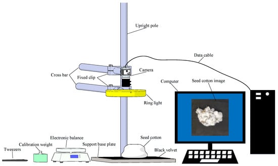 The image acquisition of machine-picked seed cotton is conducted using a portable mobile camera mounted on a bracket for vertical downward-shooting. Figure 1 illuminates the image-acquisition system, which consists of a computer, a camera (Xiaomi Corporation, Beijing, China), a light source (CRENOV, Shenzhen, China), a height-adjustable operating platform, pieces of seed cotton (Shihezi, China), tweezers, electronic balance (CHANGXIE, Dongguan, China), and calibration weight. The seed cotton is placed in its natural state on top of black velvet on the base plate. The shooting distance is approximately 0.25 m directly above the seed cotton. Illumination is provided by a 26 cm diameter, 10 W ring-shaped Light Emitting Diode (LED) white light source. The images are captured using a 12-megapixel rear wide-angle lens of the XiaoMI8 phone, featuring a 4 mm focal length, an aperture set at f/1.8, an exposure time of 1/50 s, and stored in the Joint Photographic Experts Group (JPG) format.
