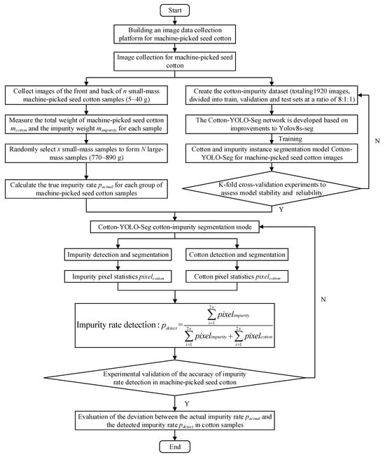 We employed the Cotton-YOLO-Seg model to accurately segment cotton and impurity pixels and to detect the impurity rate in machine-picked seed cotton images. Finally, the deviation between the actual impurity rate pactual and the detected impurity rate pdetect of the cotton samples was evaluated. The flowchart illustrating the entire experimental concept is shown in Figure 2.