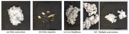Cotton is a vital agricultural and strategic commodity worldwide [1]. In 2023, Xinjiang’s cotton sown area reached 2.37 million hectares, with a production output of 5.11 million tons, representing 91% of China’s total cotton production. Mechanized cotton harvesting has become the mainstream trend, with the machine harvesting rate in the Xinjiang region surpassing 85%. However, machine-picked seed cotton contains significant impurities, with an uneven size and mass distribution. The impurity rate of machine-picked seed cotton is a crucial indicator for evaluating the quality of cotton harvesting and grading. Quantitative detection of the impurity rate in machine-picked seed cotton can reflect the harvesting performance of the cotton picker and guide subsequent operations, such as cotton purchasing, processing, and grading [2,3].