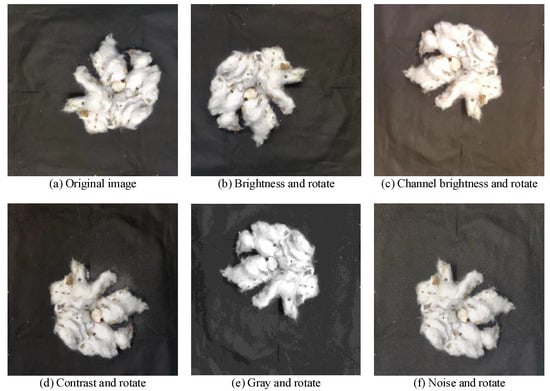 The precision of dataset labeling directly influences the segmentation accuracy of both cotton and impurities. Constructing a dataset of cotton-impurity images and accurately labeling them is both time-consuming and labor-intensive. This study develops a small dataset of 320 images and enhances it using data-augmentation techniques to bolster the model’s robustness. We utilize Labelme to categorize targets in the cotton images into two classes: cotton and impurity. The polygonal areas of cotton and impurities are manually annotated, and the labeled files are saved in JavaScript Object Notation (JSON) format. Figure 4 illustrates the enhancement of image data through flipping, grayscale adjustment, brightness adjustment, contrast adjustment, and noise addition. By combining the original images with the data-enhanced images and their labels, the manuscript creates the cotton-impurity dataset, which contains a total of 1920 images and 1920 JSON-labeled files. Subsequently, the JSON annotation files are converted to a Text (TXT) format compatible with YOLO and randomly partitioned the dataset into training, validation, and test sets in a ratio of 8:1:1, yielding 1536, 192, and 192 images, respectively.