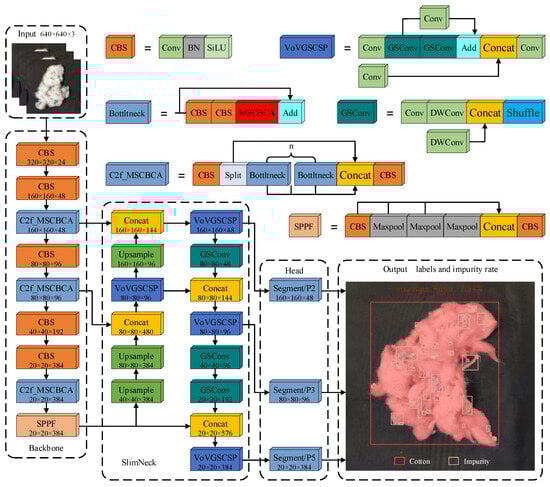 The original Yolov8-Seg algorithm exhibits poor detection and segmentation accuracy for the cotton-impurity dataset, especially for small-target impurities with more obvious missed detections. The improved network structure is illustrated in Figure 5. This manuscript introduces a novel C2f_MSCBCA module, incorporating Multi-Scale Convolutional Block Attention (MSCBCA) mechanism that integrates Convolutional Block Attention Module (CBAM) and Multi-Scale Convolutional Attention (MSCA) within the Faster Implementation of Cross Stage Partial Bottleneck with 2 Convolutions (C2f) module of the feature extraction network in Yolov8s-Seg while eliminating the Pyramid 4 (P4) feature layer. Additionally, this work incorporates the SlimNeck structure into the feature-fusion network, adds the Pyramid 2 (P2) small target detection layer, and removes the P4 feature layer. The improved Cotton-YOLO-Seg model for cotton-impurity segmentation is then subjected to transfer learning using the Common Objects in Context (COCO) [38] instance segmentation dataset.