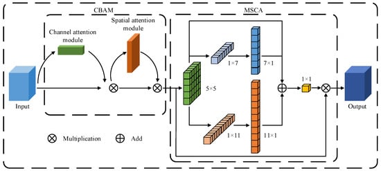 where F represents the input features, F′ denotes the feature map obtained by channel attention weighting, Mc(F) stands for the channel attention output weights, F″ means the feature map obtained by spatial attention weighting, Ms(F) refers to the spatial attention output weights, AttMSCA indicates the MSCA attention output weights, Out signifies the output features, ⊗ is the element-wise matrix multiplication operation, DW-Conv denotes the deep-wise convolution, Scalei represents the ith branch in the MSCA attention map, with i ∈ {0,1,2}, and Scale0 symbolizes the identity connection.