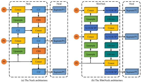 The Yolov8 base model employs three scale feature layers within its Neck network structure. For an image with an input size of 640 × 640 pixels, feature layers with downsampling factors of 8, 16, and 32 are used to detect and segment target objects of different sizes, corresponding to small, medium, and large targets, respectively. However, since most impurities in cotton images are smaller than one-tenth of the input image size and are numerous and densely distributed, the original Neck network structure fails to meet the required detection and segmentation accuracy. Figure 7 illustrates a comparison of the neck network structure pre- and post-improvement. Introducing the SlimNeck network structure, which consists of the Group Shuffle Convolution (GSConv) module and the VoV-Group Sparse and Cross-Stage Partial Network (VoVGSCSP) module, reduces the model’s complexity while maintaining accuracy [41]. The increase in network downsampling multiplicity and the gradual deepening of the network reduce the pixel percentage of small targets, potentially leading to the complete loss of pixel information for small-target impurities. The shallow network can retain more feature information and details of small-target impurities. This study adds the small-target detection layer P2 to the SlimNeck feature fusion network, with a downsampling factor of 4 for the corresponding feature layer. This addition maximizes the retention of pixel information of small-target impurities. It effectively fuses the detailed feature information of small-target impurities in the shallow features, thereby improving the accuracy of small-target impurity detection and segmentation.