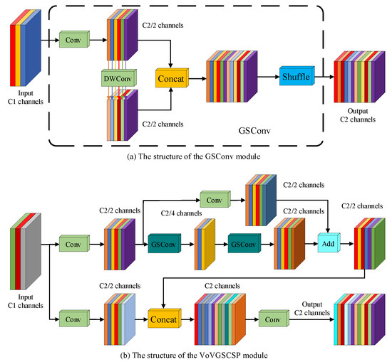 Structural diagram of GSConv and VoVGSCSP modules.