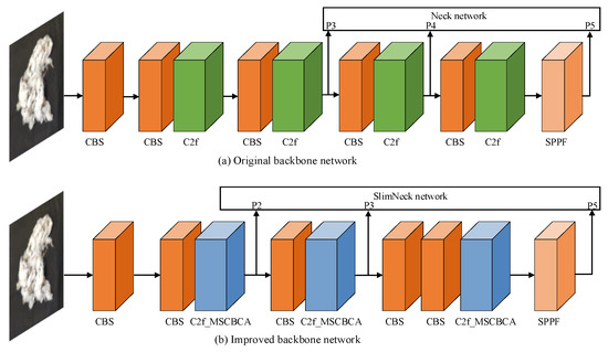 Based on the analysis of the cotton-impurity dataset, the detected objects can be categorized into two main types: large targets (cotton) and small targets (impurity). Figure 9 illustrates a comparison of the backbone network structure pre- and post-improvement. To minimize the number of parameters and computational load of the model while optimizing detection and segmentation accuracy, this study eliminates the P4 feature layer from the backbone network and integrates MSCBCA attention into the C2f module, thereby creating the novel C2f_MSCBCA module. This modification enables the feature extraction network to concentrate more effectively on the feature information of small-target impurities.