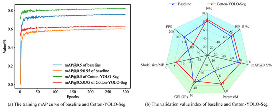 To validate the effectiveness of each improved module, we conducted ablation experiments, where a “✓” denotes the activation of the corresponding method or module. Table 3 performance comparisons of the improved model after adding different modules show that the addition of the improved MSCBCA attention module results in increases of 0.7%, 0.1%, and 0.5% in the accuracy indices P, R, and mAP@0.5, respectively. With the addition of the improved SlimNeck network structure, the model’s accuracy significantly improves, with the accuracy indices P, R, and mAP@0.5 increasing by 4.7%, 5.2%, and 6.0%, respectively. This indicates that most of the target objects in this dataset are small objects. After removing the feature layer P4 from the backbone network, the accuracy index mAP@0.5 increases by 0.4%, indicating that the improvement method is effective. Finally, after using the COCO2017 dataset for transfer learning, the accuracy indices P, R, and mAP@0.5 of the model reach 85.4%, 78.4%, and 80.8%, respectively. These values are 4.2%, 6.2%, and 6.4% higher than those of the original model. This network significantly enhances the detection and segmentation accuracy of the cotton-impurity dataset. Figure 11 shows the comparison of model performance data pre- and post-improvement.