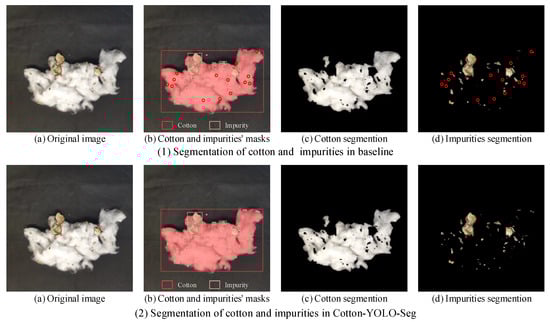 Comparison of the segmentation result of the Yolov8-seg model and Cotton-YOLO-Seg model for cotton and impurities (where the red circles in (1b,1d) indicate the missed detections of impurities by the Yolov8-seg model).
