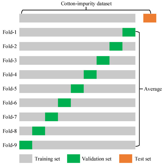 Since the original dataset in this paper is divided into training, validation, and test sets in a ratio of 8:1:1, we fixed the original test set for all K-fold cross-validation experiments to ensure they are evaluated on the same test set. To maintain consistent training conditions, the training and validation sets are also set in a ratio of 8:1. Therefore, this study conducted 9-fold cross-validation experiments on the training and validation sets by randomly selecting a subset as the validation set and the rest as the training set. The partitioning of the dataset in k-fold cross-validation can be seen in Figure 13. This process is repeated until the 9th experiment is completed. Finally, the results of the nine validations are averaged to assess the stability and reliability of the final model’s performance. The results of our K (K = 9) fold cross-validation experiments for the improved model Cotton-YOLO-Seg are shown below.