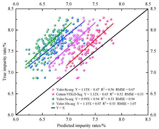 This study conducts impurity rate detection on 100 groups of machine-picked seed cotton image samples. The impurity rate is determined by directly detecting the number of impurities and cotton pixels in each sample group. Figure 15 presents the correlation analysis between the detected and actual impurity rates for each group of cotton samples using different models. The equation relating the detected impurity rate to the actual impurity rate for the Cotton-YOLO-Seg model is y = 1.12x − 0.65, which is closest to y = x. Therefore, the detected and actual impurity rates of the Cotton-YOLO-Seg model are nearly identical. In contrast, the equation for the original Yolov8s-seg model is y = 1.15x − 0.47, indicating a significant deviation from y = x. Table 6 presents the performance evaluation of impurity rate detection across different models. The MAE, RMSE, and MAPE for the Cotton-YOLO-Seg model are 0.29%, 0.33%, and 3.70%, respectively, representing reductions of 52.46%, 48.44%, and 53.75% compared to the original Yolov8s-Seg model. The data indicate that the Cotton-YOLO-Seg model has significantly reduced the deviation between the detected and actual impurity rates. These data demonstrate the advancement of the yolov8s-seg segmentation model in machine-harvested seed cotton compared to yolov5s-seg and yolov10s-seg. They also validate the improvements in the Cotton-YOLO-Seg model and echo the corresponding model data in Table 5 and Figure 14.