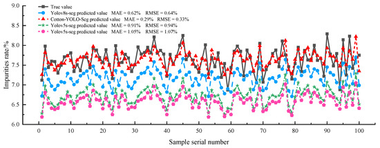 Figure 16 illustrates a line graph comparing the detected and actual impurity rates for 100 sets of cotton samples across different models. The figure clearly demonstrates that the Cotton-YOLO-Seg model detections are more accurate and have smaller errors than other models. The MAE between the detected and actual impurity rates for the Cotton-YOLO-Seg model is only 0.29%, indicating that it fulfills the design requirements. The other models indicate that the overall detected impurity rate in seed cotton images is underestimated.