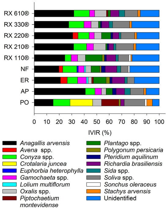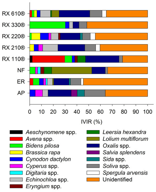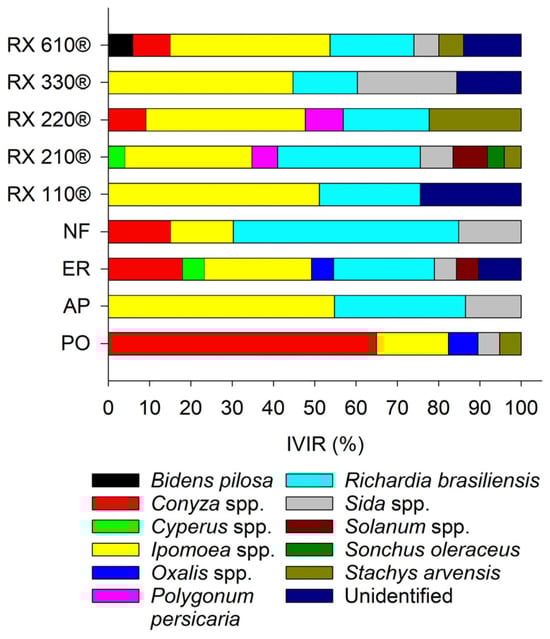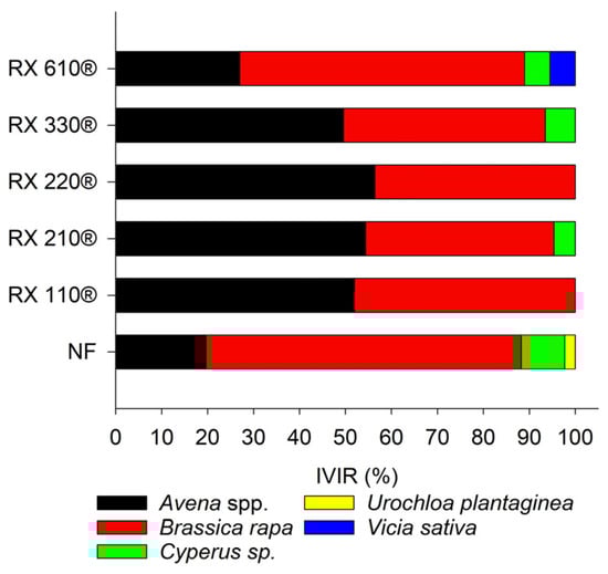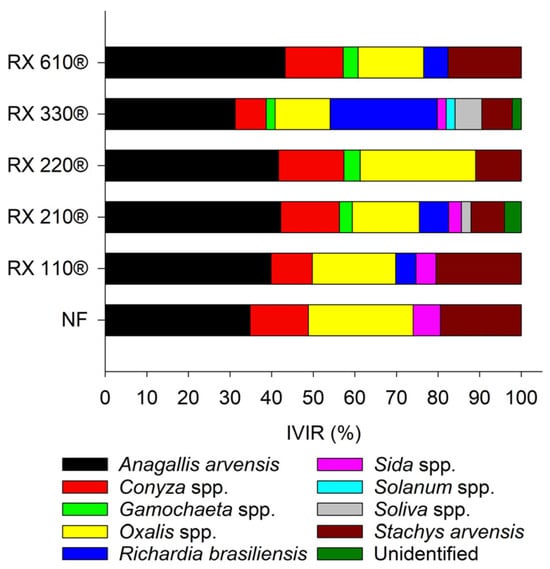 A phytosociological survey was carried out during the development of cover crops, and 10 families of weeds were observed, of which the main ones were Poaceae (IVIR of 19.85%), Oxalidaceae (17.89%), and Asteraceae (14.29%) (Figure 5). In the Poaceae family, Cynodon dactylon was not found in the NF treatment, and the highest IVIR was evidenced in treatment with RX 220® (Figure 5). Echinochloa spp. were not observed in the NF or RX 110® treatments. There was no statistical difference between the average dry mass of the aerial parts of the cover plants, and a harvest was not performed (Table S1).