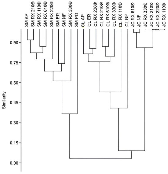 The first cluster was formed in Júlio de Castilhos, where the similarity between treatments had an SI greater than 0.8 (Figure 6). The treatments with RX 330®, RX 210®, RX 220®, and RX 330® formed a subgroup with an SI close to 1.0, similar to the RX 610® and NF treatments (Figure 6). The SI was equal to 0.4 in Santa Maria, while it was higher than 0.4 in Capão do Leão (Figure 6). In Santa Maria, fallow (SM PO) had a different floristic composition than the other treatments. For Capão do Leão, as there was no fallow, forage turnip (CL NF) had less similarity than the other treatments.