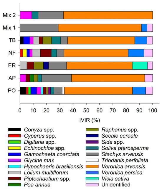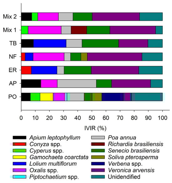 Overall, eight families of weeds were observed in Barra do Ribeiro, with the most relevant families being Plantaginaceae (IVIR of 27.51%), Asteraceae (18.47%), and Poaceae (18.06%) (Figure 7). Veronica arvensis had the highest index and was present in all treatments. It stood out in a survey of Conyza spp. in treatments with NF (IVIR of 2.79%) and ER (5.22%). Another important species was L. multiflorum, which was only observed in treatments with NF (IVIR of 5.63%), ER (18.19%), and TB (23.19%). Additionally, R. brasiliensis was only observed in Mix 1 (IVIR of 11.09%).