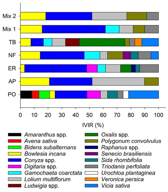 Phytosociological analysis of weeds using the importance value index (IVIR) during cover crop development in Júlio de Castilhos in the 2020–2021 season. The composition of the treatments is provided in Table 1.