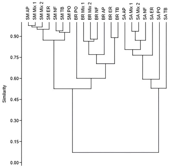 Cluster analysis for similarity between weeds observed at different sites (BR—Barra do Ribeiro; SA—Santo Ângelo; SM—Santa Maria) for treatments with cover crops used in the 2021–2022 harvest. Cophenetic coefficient of 0.97. The composition of the treatments is provided in Table 1.