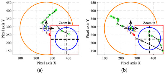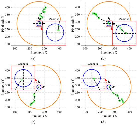 The experimental data were recorded in the same way as in Section 4.1. The motion paths of some green marker points are depicted in Figure 27a–d. As shown in Figure 27e, incorporating state feedback resulted in the end-points of the motion paths of the green marker points, regardless of the starting quadrant, eventually falling within the error circle.