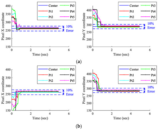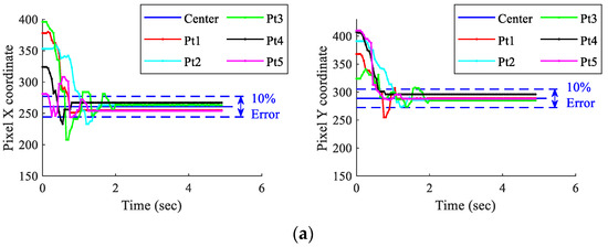 Using time as the horizontal axis, it was observed that the trends of the pixel X and Y coordinates of the end-points fit within the 10% error, as depicted in Figure 28. Furthermore, both the pixel X and Y coordinates of the end-points tended to stabilize within 2 s. These results indicate that the LQR state feedback exhibited certain levels of both speed and stability.