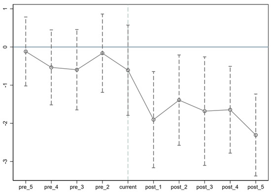 where is a set of dummy variables, and the meaning of the remaining variable symbols is consistent with the baseline model. In this paper, the data of the five months before the policy implementation are combined into period −5, while the data of the five years after the policy implementation are combined into period 5, and the data of the period before the policy comes into effect are excluded as the reference group, in order to avoid the problem of full covariance.