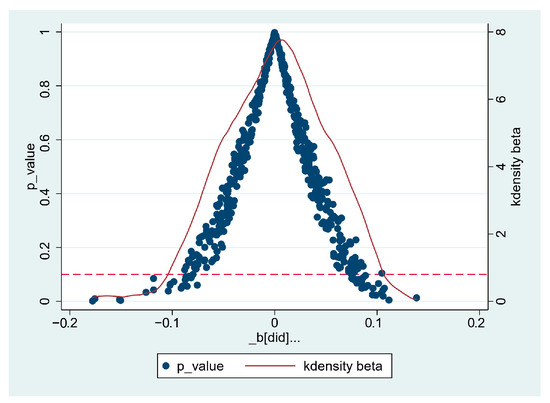 Second, the placebo test is conducted by randomly selecting the experimental group. An unrepeated random sampling of agricultural machinery products is conducted to categorize the selected products into a pseudo-treatment group and to create a placebo-tested trade friction dummy variable. To exclude the interference of other factors, 500-times sampling is conducted. Figure 4 and Figure 5 report the estimated coefficients and densities, and the corresponding p-value distributions, for the 500-times pseudo-treatment group for agricultural machinery products imported from the U.S. and those imported from 16 other countries. The results show that the means of the two regression coefficients are close to 0, most of the p-values are greater than 0.1, and most of the estimated coefficients do not pass the test of significance, thus ruling out the possibility of pseudo-regression and indicating that the test results are robust.
