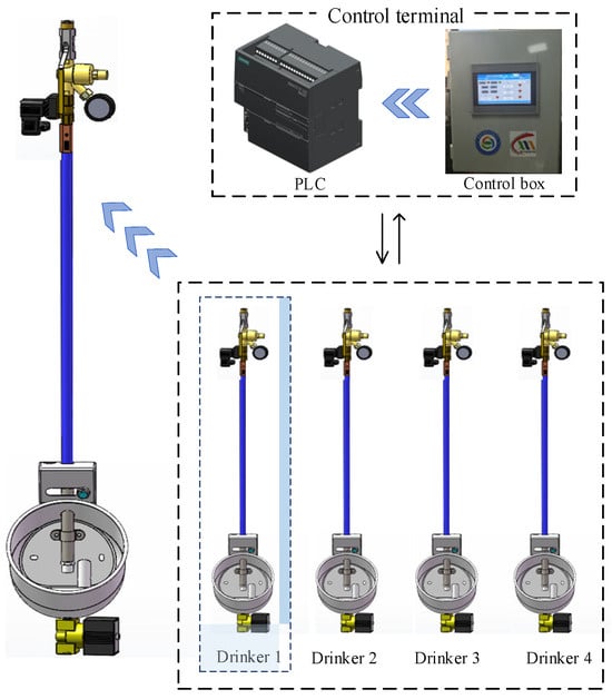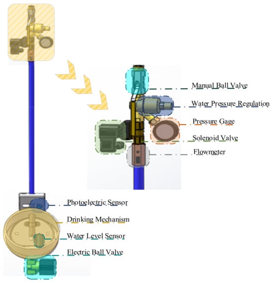 Each drinker is equipped with a variety of sensors as input devices, which can monitor the water level, water consumption and drinking behavior of pigs in real time [21]. The structure of the drinker is shown in Figure 1, and the design standard of the drinker in Figure A1 is shown in the Appendix A.