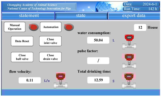 The control system consists of two control modes: a manual mode and automatic mode. In the manual mode, the keeper can manually control the switch of each valve with the help of the PLC panel, and the collected drinking water volume data will be displayed in the table in real time and can be copied at any time. In the automatic mode, the detection switch is used to detect whether the pig is in the drinking position. When the pig has only reached the drinking position, stays there for more than 5 s, and it has been more than 15 s since the last triggering of the water, the intake valve opens. From the opening of the inlet valve to the point at which the water level gauge detects that the set water level has been reached, the data of the volume of drinking water will be automatically collected and uploaded [25]. In order to prevent water waste, each drinking bowl should be filled with a maximum of 1.5 L within 60 s to reduce the possibility of pigs playing with water.