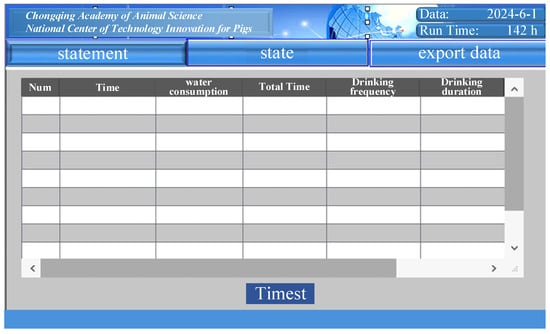The display interface of the intelligent drinking water controller adopts the MCGS touch screen, as shown in Figure 5. In addition to the remote-control function, the remote monitoring system can also monitor the water consumption in the pig pen in real time and the drinking time of the pigs. This means that farm managers can determine the drinking situation of pigs in real-time, detect anomalies in time and take appropriate measures. At the same time, the intelligent drinking water controller also has the function of output reports, as shown in Figure 6. This makes data analysis much easier and more intuitive. Farm managers can conduct an in-depth analysis of the drinking water of pigs according to the data in the report, so as to optimize the feeding management plan and improve the breeding efficiency.