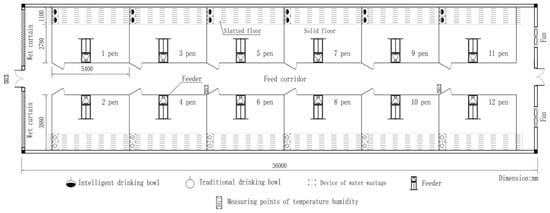 This study was conducted at the Shuanghe Experimental Base of the Chongqing Academy of Animal Sciences. The aim was to compare the effects of using an intelligent drinking water controller with the effects of using traditional drinking bowls. To achieve this, we set up 12 pens as experimental sites, each housing 7 fattening pigs. In these sites, two different drinking schemes were adopted: 6 sites were equipped with an intelligent water control system, while the other 6 used traditional drinking bowls or nozzles. The positions of the drinkers are shown in Figure 6.