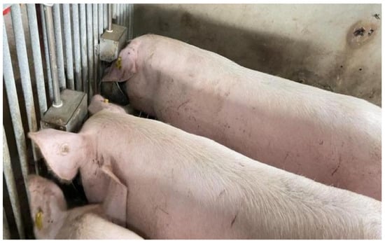 Throughout the experiment, all pigs underwent standard immunization programs to ensure their health status. Additionally, the pigs were allowed to feed and drink freely to simulate natural breeding environments. To ensure the accuracy and reliability of the experiment, we paid special attention to the cleanliness and hygiene of the sites, regularly disinfecting them to provide a clean and hygienic living environment for the pigs. The installation positions and environmental layout of the drinking bowls in the experimental group and the control group are shown in Figure 7. The life picture of fattening pigs in the experimental environment is shown in Figure 8.